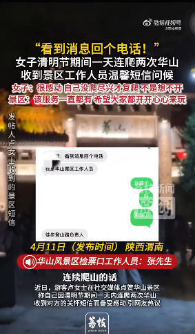 近日,旅客卢女士在莽撞媒体发帖称我方因明朗节技能一天内连爬两次华山,收到对方的珍惜短信,引网友热议。