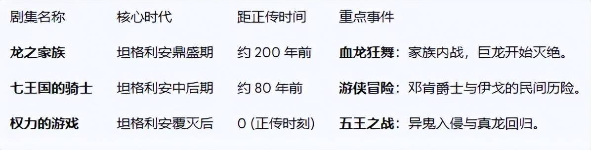 通俗来说,本剧的故事发生在《龙之眷属》中惨烈内战终止之后,距离《职权的游戏》的“五王之战”还有近八九十年。