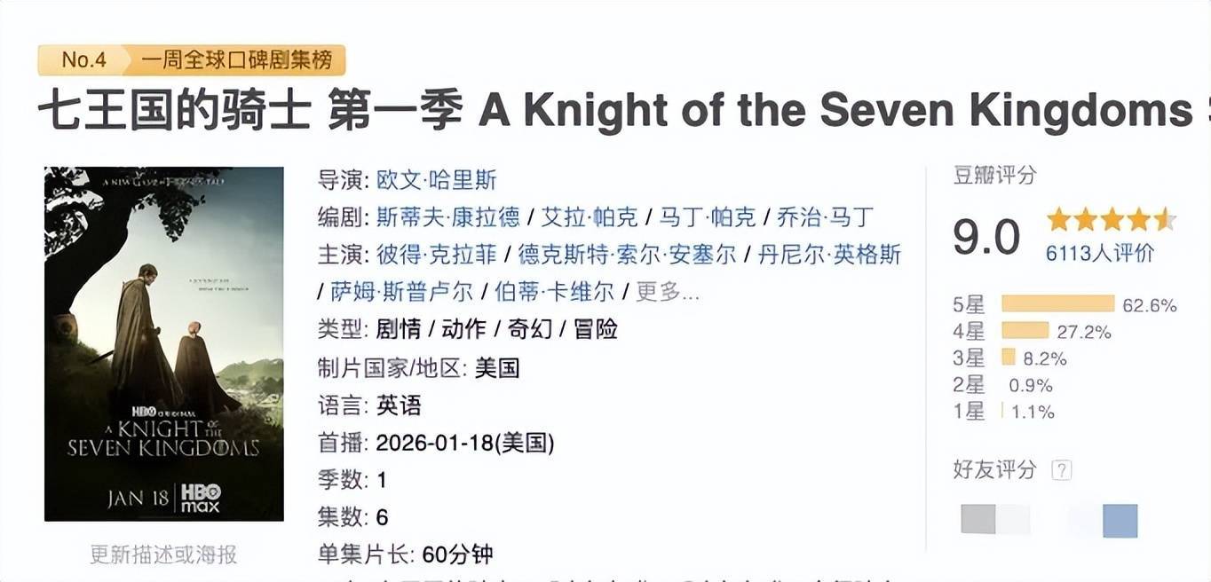 《七王国的骑士》看成《权游》的繁衍剧,自1月19日开播以来广受好评,烂番茄崭新度95%,豆瓣上6000多名不雅众更是打出9.0的高分。