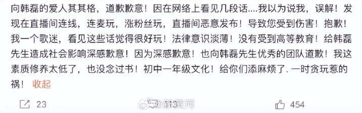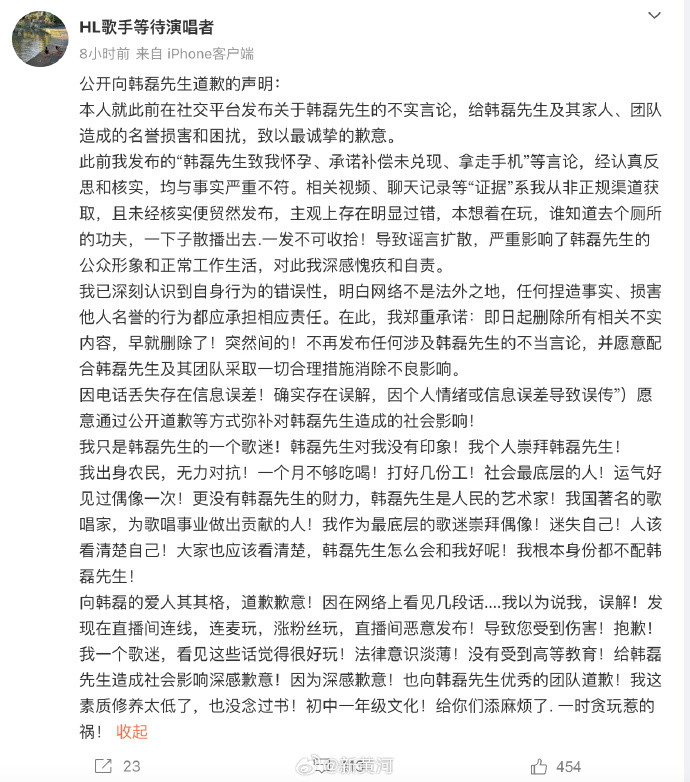 据悉,女网友“调节”在27日发文控诉与韩磊存在不方正干系,韩磊在她孕珠后答应支付100万,但很快玩“东说念主间失散”,她在29日发文说念歉,自称发布实质与事实严重不符,是闹着玩,严重影响了韩磊的形象,深感傀怍和自责。自曝我方训导低,只消初汉文化,因为珍贵韩磊才抓造斥责。