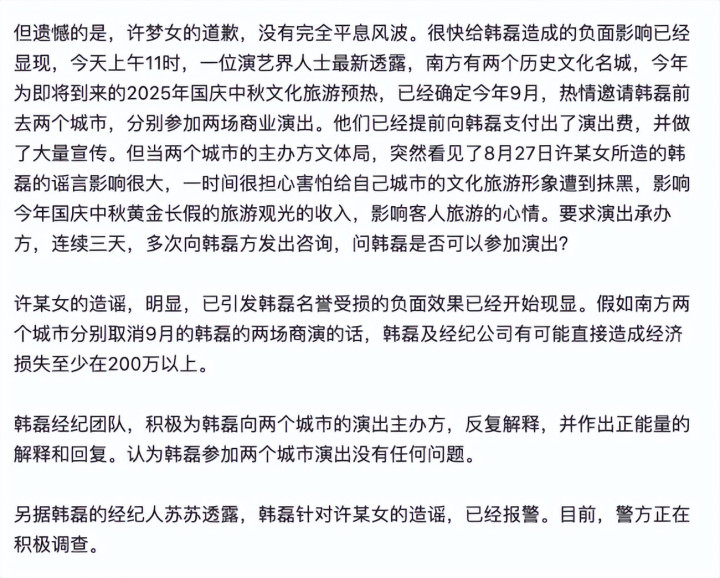 原本韩磊本年9月要去两个城市商演,对方也曾支付了献技费,同期作出大王人宣传,因为女网友爆料韩磊出轨,主办方挂念因韩磊风云给城市带来负面形象,影响中秋国庆长假收入,此前也曾屡次斟酌韩磊,若是接下来韩磊取消献技,形成至少200万以上的经济失掉。