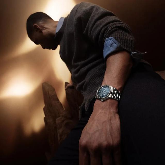 这种对称双盘布局,灵感来自1951年积家经典的Futurematic手表,今天看依然前锋。副盘以惜字如金的环形饰纹润饰,与主盘的蓝灰色太阳辐照状渐变酿成精细呼应,三个圆之间的光影流转也有一种机要的动态节拍感。