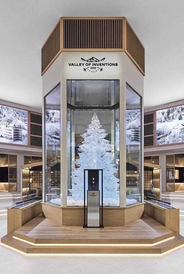 展厅中央立着一棵近四米高的冰雕松树,磨砂玻璃蔓延出冰原般的冷冽,让我一秒钟思起曾见过的汝山谷冬日表象,而这里的制表业,正是发祥于几百年前大雪封山的冬日。