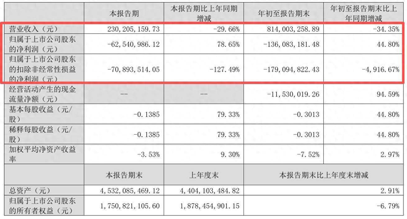 第三季度,公司贸易收入为2.3亿元,同比下降29.66%;归母净利润自旧年同期耗费2.93亿元变为耗费6254.10万元,耗费同比减少78.65%;扣非归母净利润自旧年同期耗费3116万元变为耗费7089万元,耗费额进一步扩大。