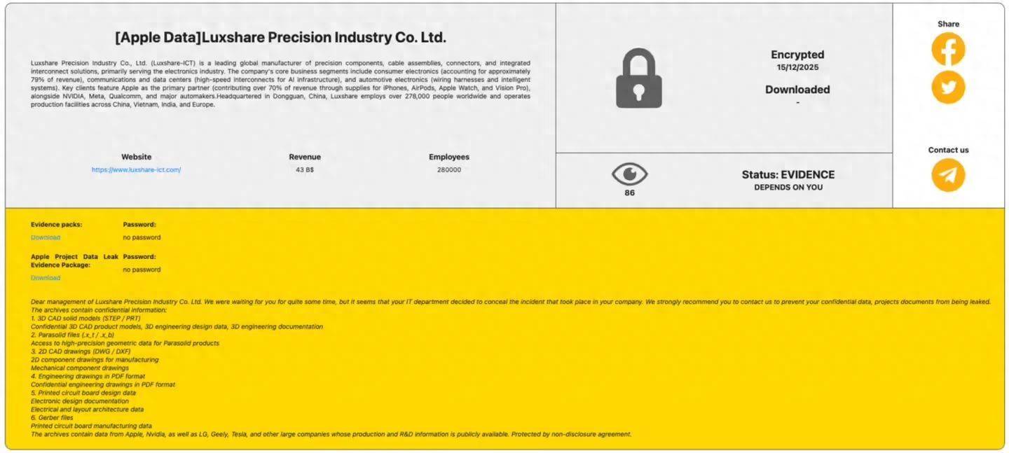 DoNews1月22日音问,据IT之家征引外洋科技媒体 CyberNews 报谈,称苹果中枢代工场立讯精密(Luxshare)遭绑架软件组织 RansomHub 袭击,包括苹果、英伟达、特斯拉及 LG 在内的多家科技巨头神秘数据面对透露风险。